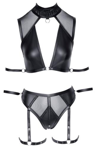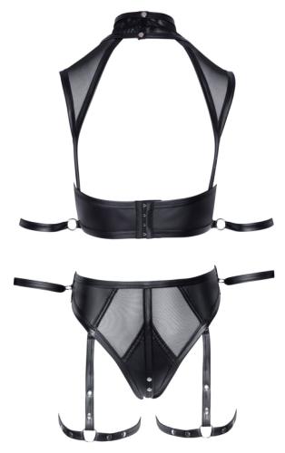 Dieses 2-teilige Set ist perfekt für einen frechen Abend! Das Set im matten Look hat transparente und dekorative Details. Der passende Slip hat praktische und erotische Druckknöpfe im Schritt, und die Oberschenkelgurte sind abnehmbar. Die Arm- und Handfesseln haben verstellbare Klettverschlüsse und sind ebenfalls abnehmbar. Das Set ist dank des elastischen Materials bequem zu tragen.