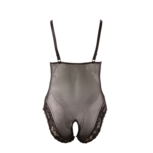 Schwarzer Powernet-Body mit offenem Schritt. Cups und Beinausschnitte mit Spitzenverzierung. Träger verstellbar. 90% Polyamid, 10% Elasthan.