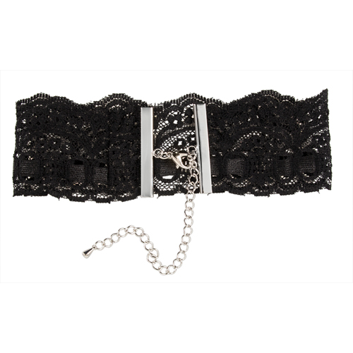 Schwarzes Spitzen-Halsband mit Ketten/Karabinerverschluss – mehrfach verstellbar. 100% Polyester.