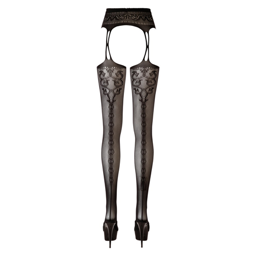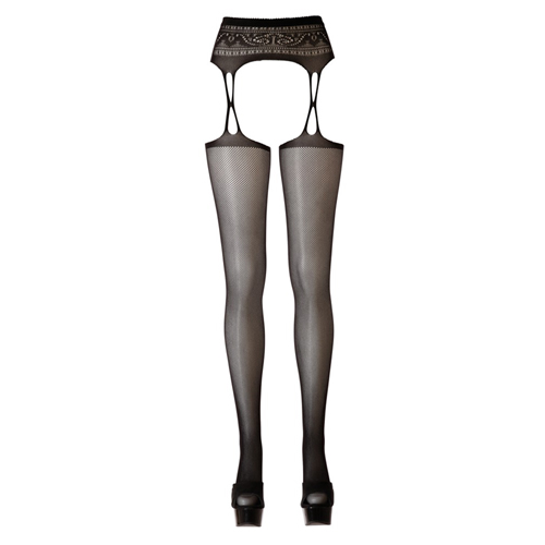Nahtlos gefertigter, schwarzer Strapsgürtel in Spitzenoptik mit angewebten, schwarzen Netzstrümpfen mit Naht und Spitzenoptik hinten. 90% Polyamid, 10% Elasthan.