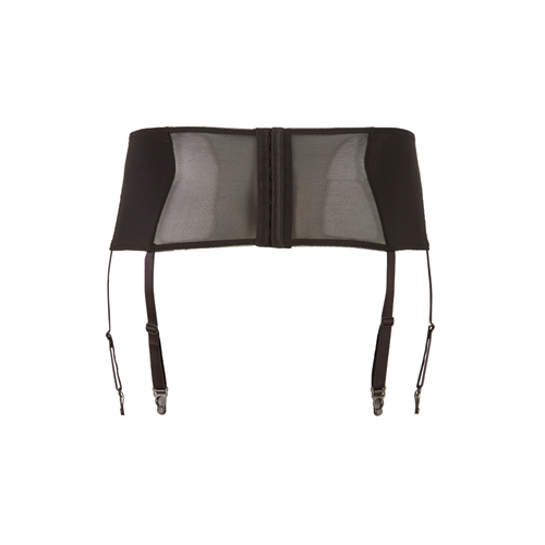 Strapsgürtel mit Spitzeneinsätzen, kleiner Schnürung in der Front, Hakenverschluss im Rücken und sechs verstellbaren Strapshaltern. Schwarz. 90% Polyamid, 10% Elasthan. Ohne Strümpfe.