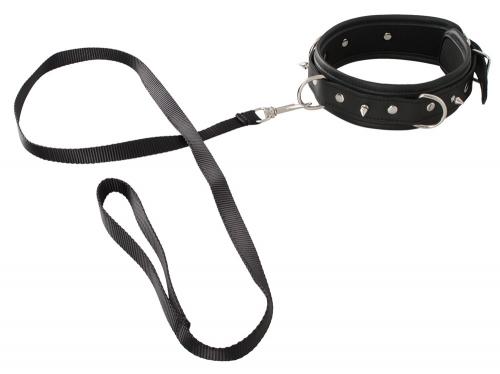 Die Halsfessel in Leder-Optik ist weich gepolstert und besticht mit dekorativen Spikes und D-Ringen. Die Webriemen-Leine ist abnehmbar. Vegan.